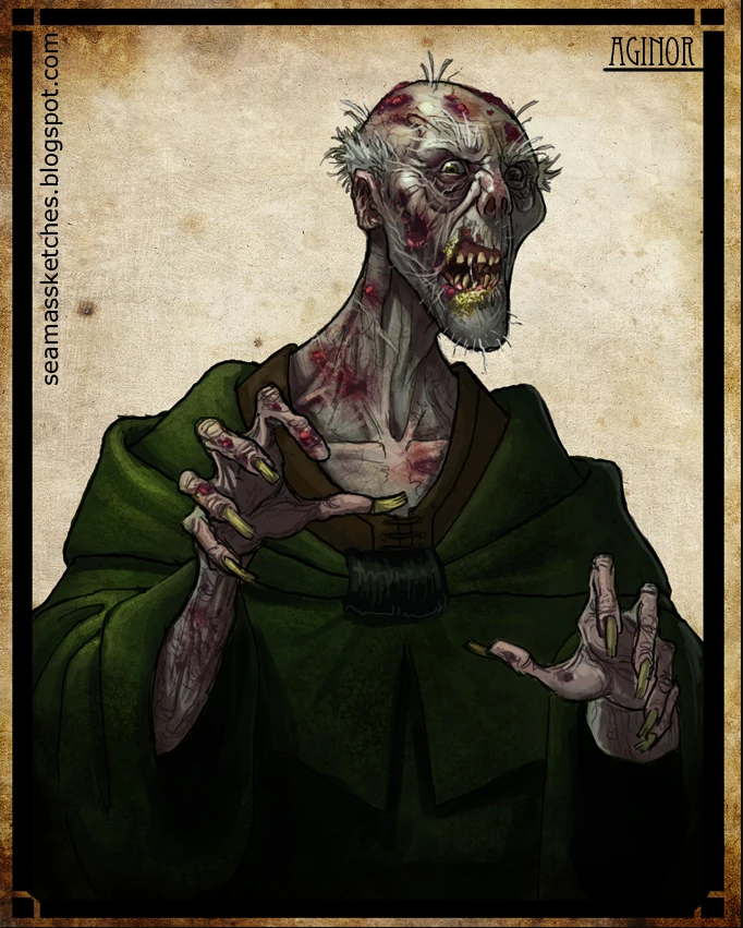 AgniorAginor was sealed very close to the surface of the Bore and as a result time altered his features quite significantly. The skin of his face was like crazed parchment drawn tight over a skull, then pulled tighter still. Wispy tufts of brittle hair stood at odd places on his scabrous scalp. His ears were withered bits like scraps of ancient leather; his eyes sunken, peering out of his head as if from the ends of tunnels. Before turning to the Shadow, Ishar Morrad Chuain (Aginor) was a famous biologist. However, his complete lack of empathy resulted in him performing a number of unauthorized, unethical experiments. When these experiments were discovered by the Hall of Servants, he was sanctioned and forbidden to conduct any further genetic experimentation. This was unacceptable to him, and desiring more freedom to operate, he pledged himself to the Shadow during the War of Power. Sometime during the relatively early stages of the war, he discovered a way to create an animal/human hybrid of limited intelligence that could function as a shock-trooper and which bred at an astounding rate. These creatures became known as Trollocs and became the backbone of the Shadow's armies during the war. He also created a number of more specialized monsters, including Draghkar, Gholam, and Myrddraal amongst others. It is believed that somewhere between 35 and 50 million people died in the experiments that resulted in the Shadowspawn, at a rate of almost 10,000 per day. He was never directly involved with any military campaigns, and seemed to have done little during the war beyond his experiments. Despite this however, these experiments gave him an extraordinarily high body count, even for one of the Forsaken. Aginor and Balthamel were sealed near the surface of the Bore, and as such aged immensely by the time of their release. During his sleep of three thousand years, Aginor experienced endless nightmares. He and Balthamel were the first to be released. After his release, Aginor attempted to control all of the One Power from the Eye of the World; but he drained too much of it in a single time, so it was too much for him to control and Aginor was burned to ashes. |
